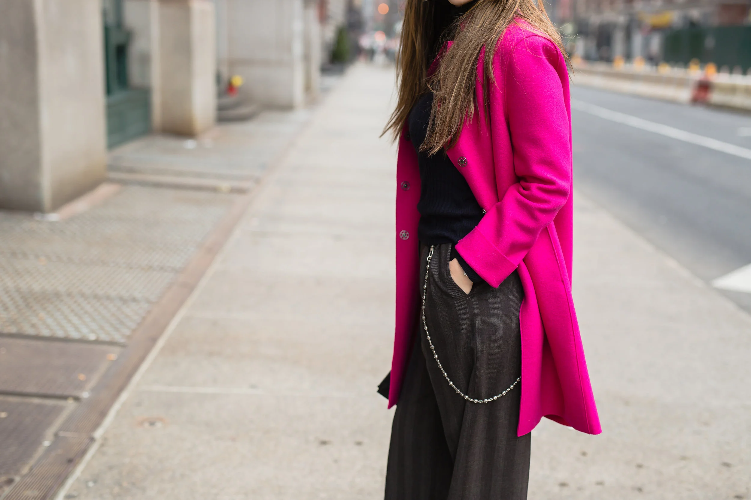 Pants - Dries Van Noten / Navy Turtleneck / Ankle Boot - Chanel / Wallet Chain - Chrome Hearts / Clutch - Givenchy / Sunglasses - Chanel / Pink Coat /