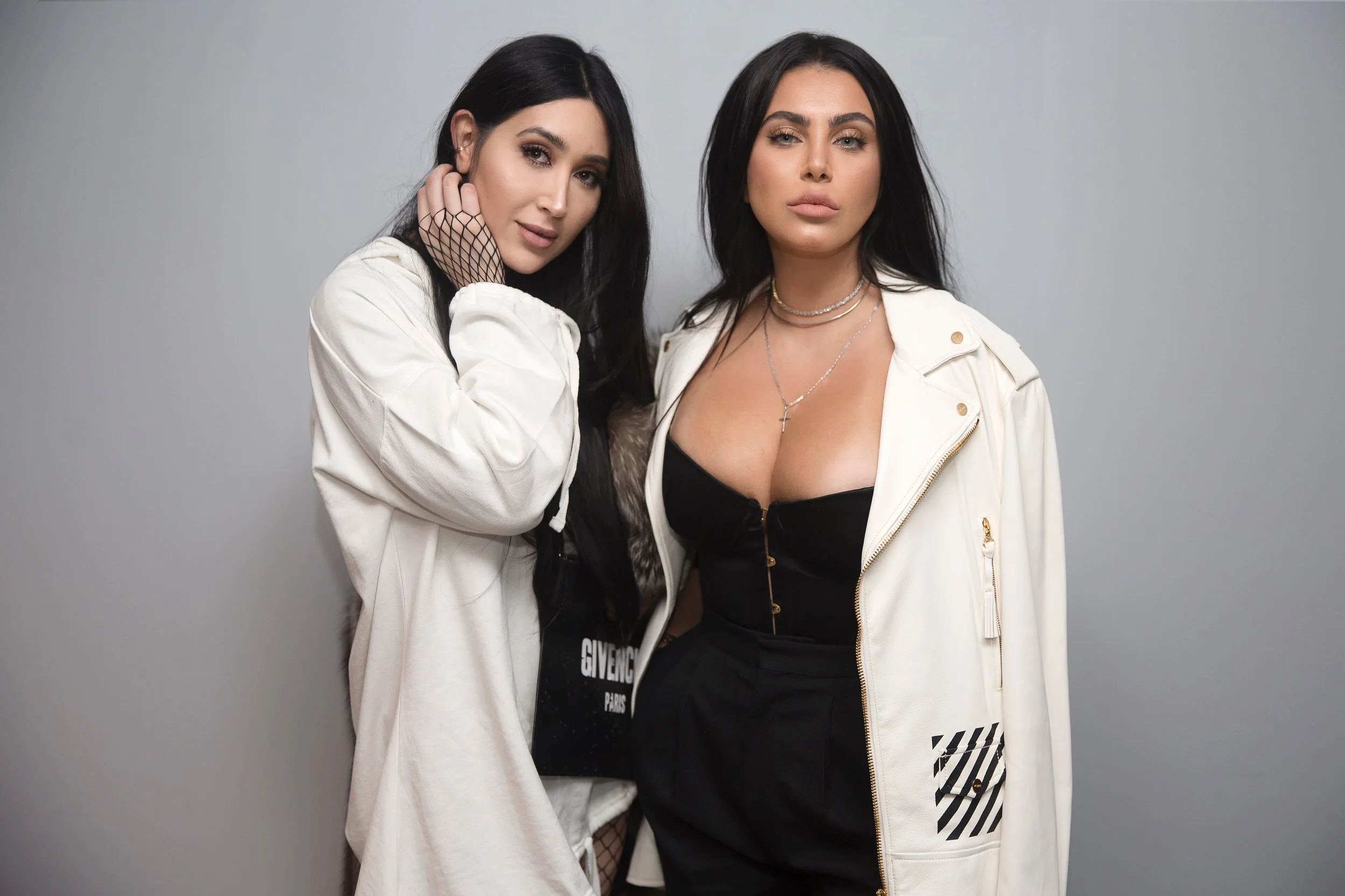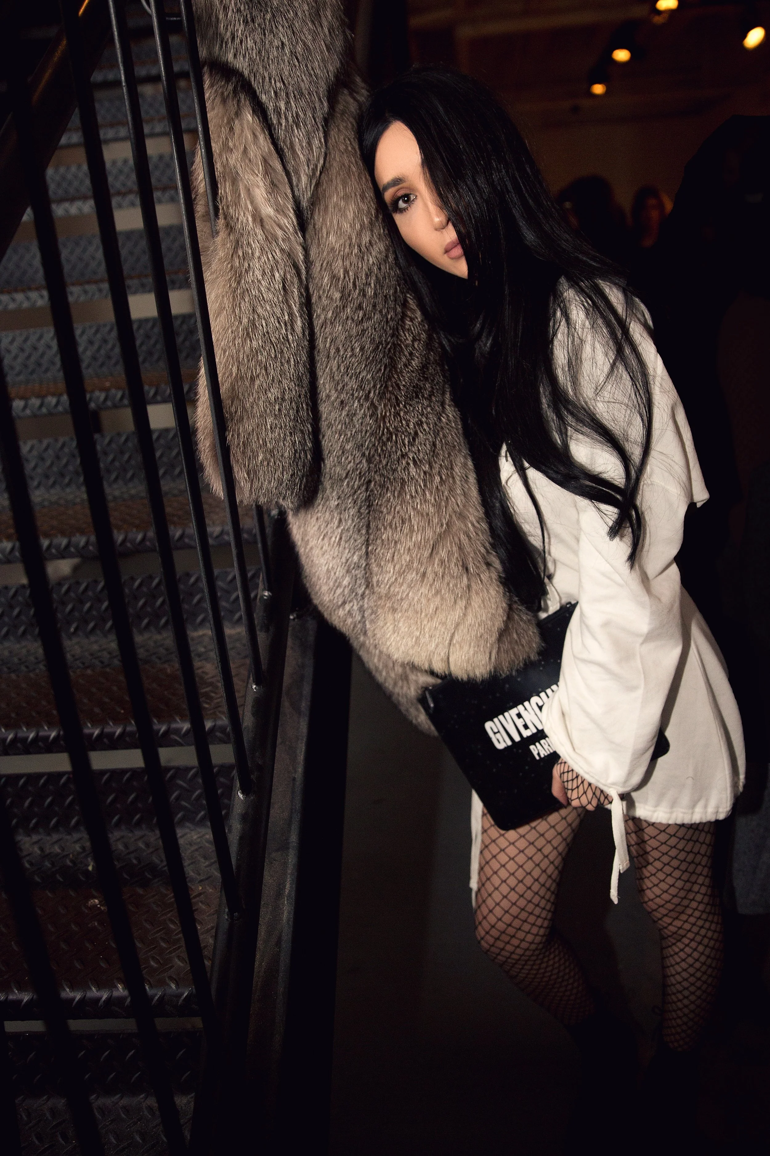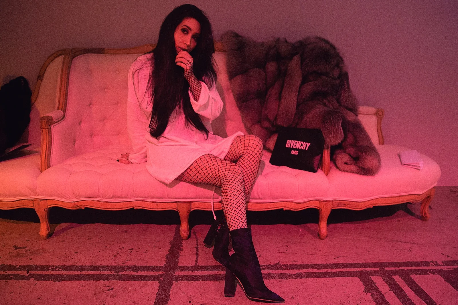 Fishnet BodySuit / White Sweatshirt Dress / Givenchy Envelope Clutch / Dior Boot (similar)
