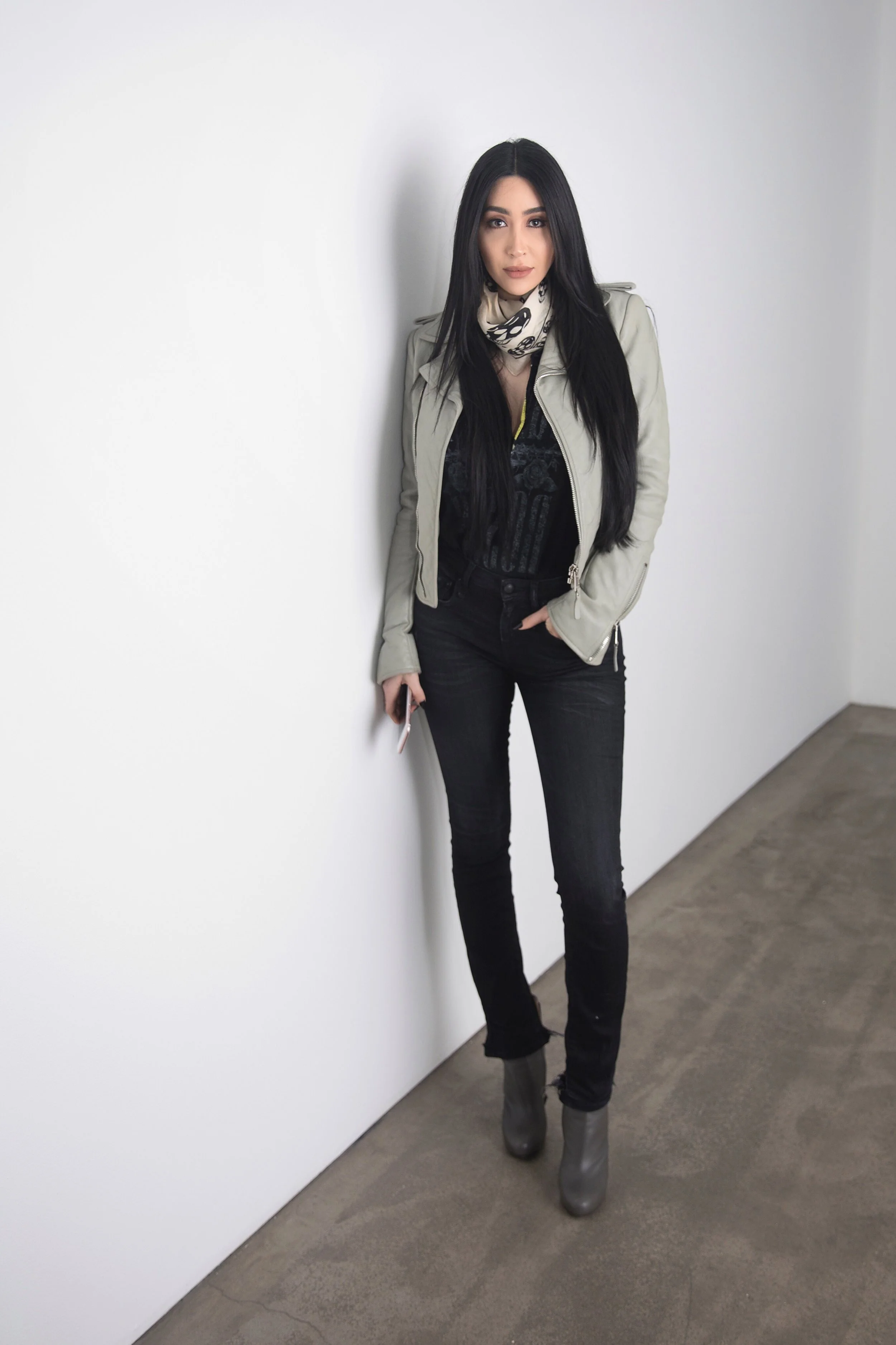 R13 Jeans / Guns and Roses Vintage Tee / Balenciaga Leather Jacket / Alexander McQueen Scarf / Grey Leather Boots